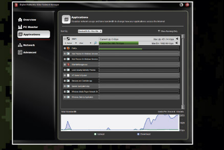 В приложении Killer Network Manager нашла применение эксклюзивная технология Visual Bandwidth Control™ компании Bigfoot Network. С ее помощью пользователи могут контролировать трафик, наблюдая какие приложения обращаются к сетевым ресурсам. Технология Advanced Game Detect™ назначает приоритет для выбранной пользователем игры, обеспечивая требуемую пропускную способность, на фоне продолжающихся процессов загрузки файлов с указанных Web-ресурсов. |