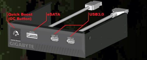 В комплект поставки системной платы G1.Assassin входит панель управления, которая предоставляет оперативный доступ к двум портам USB 3.0 и разъему Power eSATA. Передняя панель управления также оснащена клавишей Quick Boost, которая позволяет игрокам мгновенно разгонять систему одним нажатием кнопки. Теперь, даже в самый разгар битвы можно мгновенно получить прирост производительности, не перезагружая систему. |