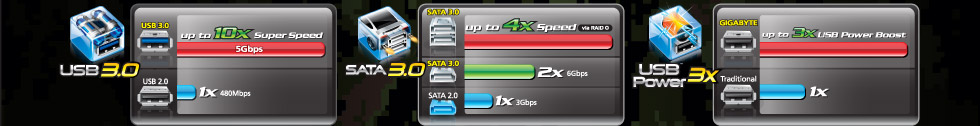 Находясь в тылу врага, игрок может погибнуть по причине задержки поступления разведывательных данных. С целью обеспечить максимальную скорость передачи данных, системные платы GIGABYTE серии G1-Killer оснащены 4 портами USB 3.0 SuperSpeed (по 2 на передней и задней панелях), и портами интерфейса SATA 3.0 ( 6 Гбит/с, микросхема компании Marvell). Кроме того, все USB-порты оснащены технологией 3x USB Power Boost и готовы к подключению даже самых энергоемких устройств. |