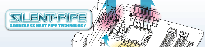 Принципиально новый теплоотвод обеспечивает охлаждение северного и южного мостов чипсета, а также силовых транзисторов схемы питания процессора и в результате значительно снижает температуру в окрестности процессора. Этот теплоотвод позволяет продлить срок службы компьютерных компонентов благодаря поддержанию более низкой рабочей температуры и свести к абсолютному минимуму уровень шума при работе компьютера. Он обеспечивает исключительно эффективное охлаждение чипсета, процессора и других компонентов системной платы.